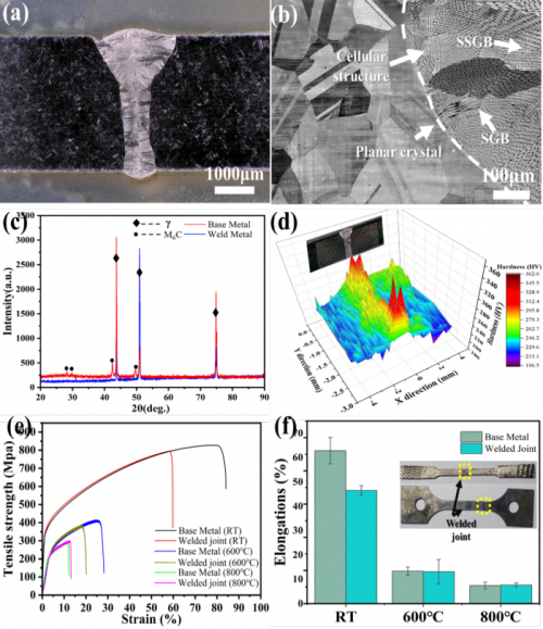 (a)GH3539激光焊接接頭焊接截面;(b)GH3539合金微觀組織;(c)GH3539合金激光焊接接頭XRD結(jié)果;(d)GH3539合金激光焊接接頭硬度分布;(e)不同溫度下母材及焊接接頭的工程應(yīng)力-應(yīng)變曲線;(f)不同溫度下母材及焊接接頭的平均延伸率。